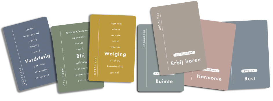 Smaakvol vormgegeven kaartenset over gevoelens en behoeftes. Een goede aanvulling voor de toolbox van een coach of om voor jezelf inzichtelijk te maken met welke emotie je te maken hebt. Deze set gaat verder dan je emoties, want waar (ver(wijzen je emoties naar? Ga op zoek naar de behoeftes die eronder liggen!Per setje van 67 kaarten €22,50 excl. verzendkosten.Stuur een e-mail naar het e-mailadres hieronder.